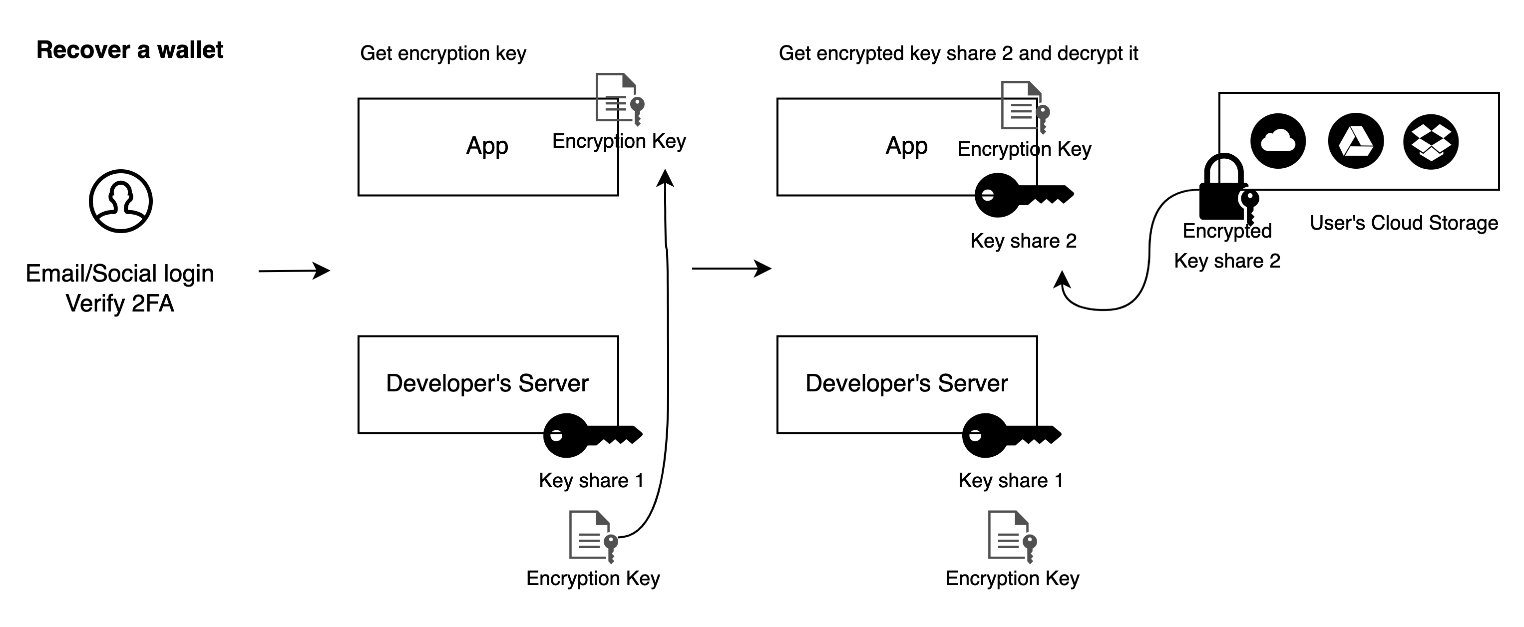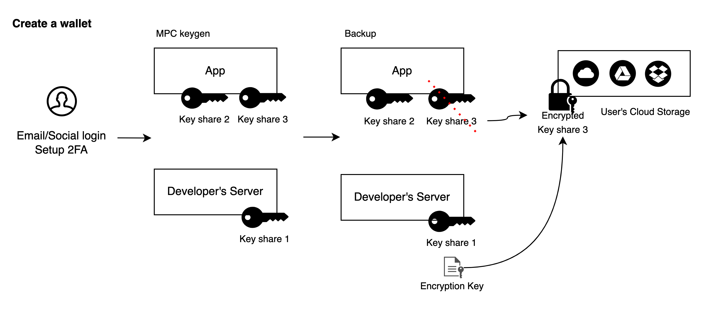 - 钱包创建完成后,开发者服务端保存一个 encryption key,将该密钥下发至应用端,应用端使用该密钥加密 Key share 2,并且将加密后的数据保存到用户控制的云端存储,如 Google Drive、iCloud 等