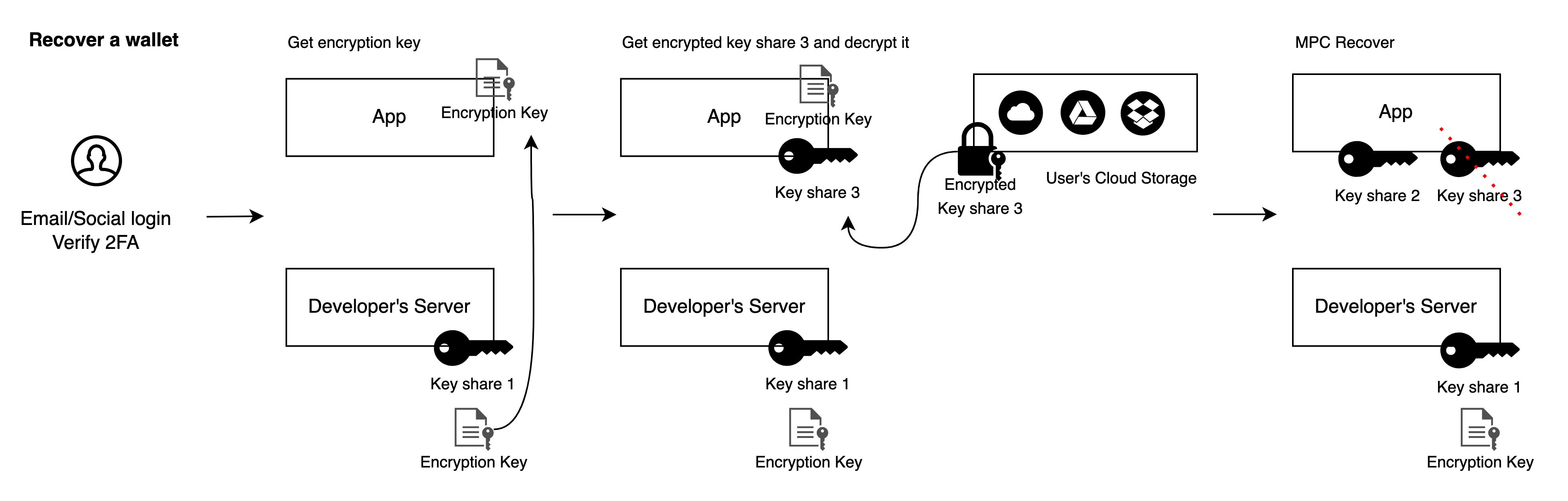 - 用户更换设备时,通过 Email/Social Login 登录后,验证 MFA,验证通过后将 encryption key 下发至应用端,应用端从用户云端存储获取加密后的 Key share 2,在应用端解密恢复 Key share 2,解密后删除 encryption key