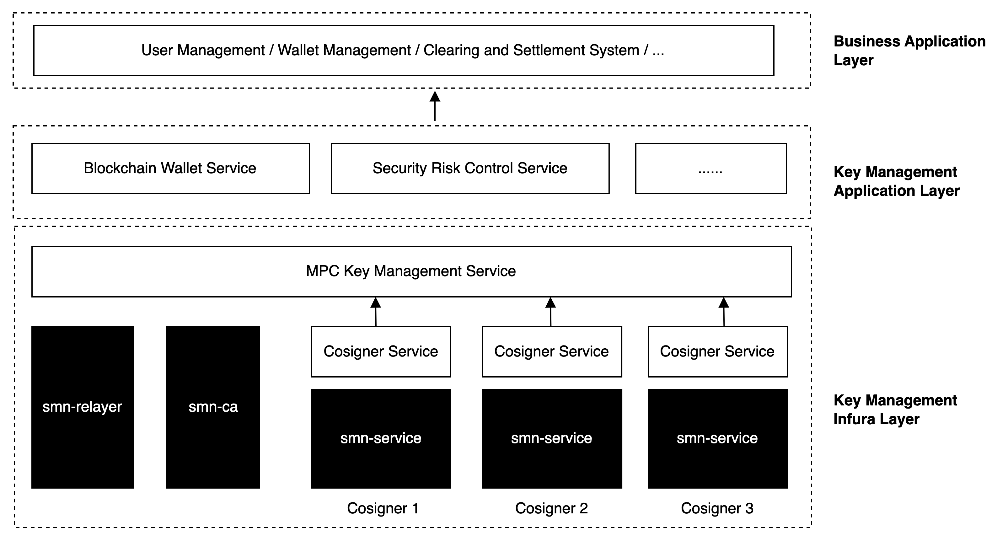 - 开发者根据自己的业务场景选择 MPC-TSS 门限,比如使用 2/3 或者 3/3 门限,开发者部署三个 smn-service 集群,分别为三个 MPC 计算参与方,通过开发者自己的 MPC Key Management Service 调度三个参与方