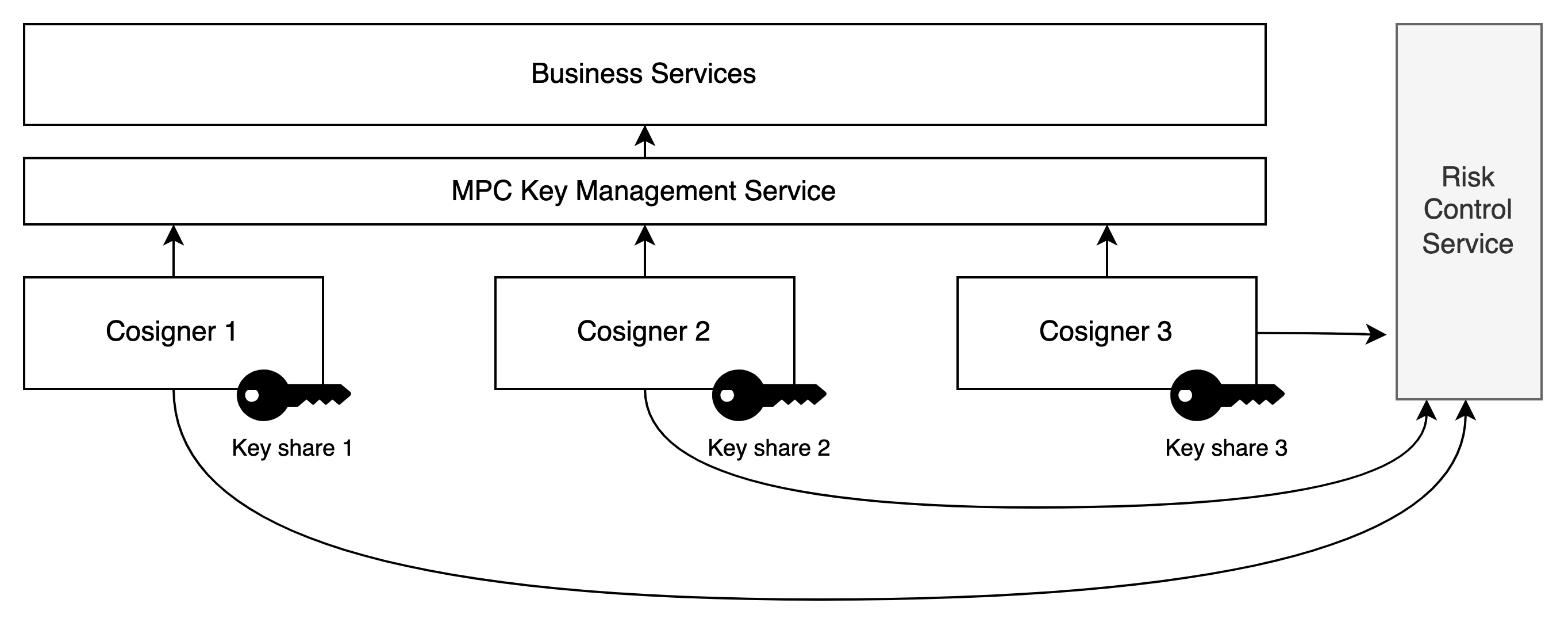 - 在执行签名敏感操作调用时,Cosigner 需要在执行操作前向安全风控服务求证请求是否合法,避免 MPC Key Management Service 被攻击造成的单点风险