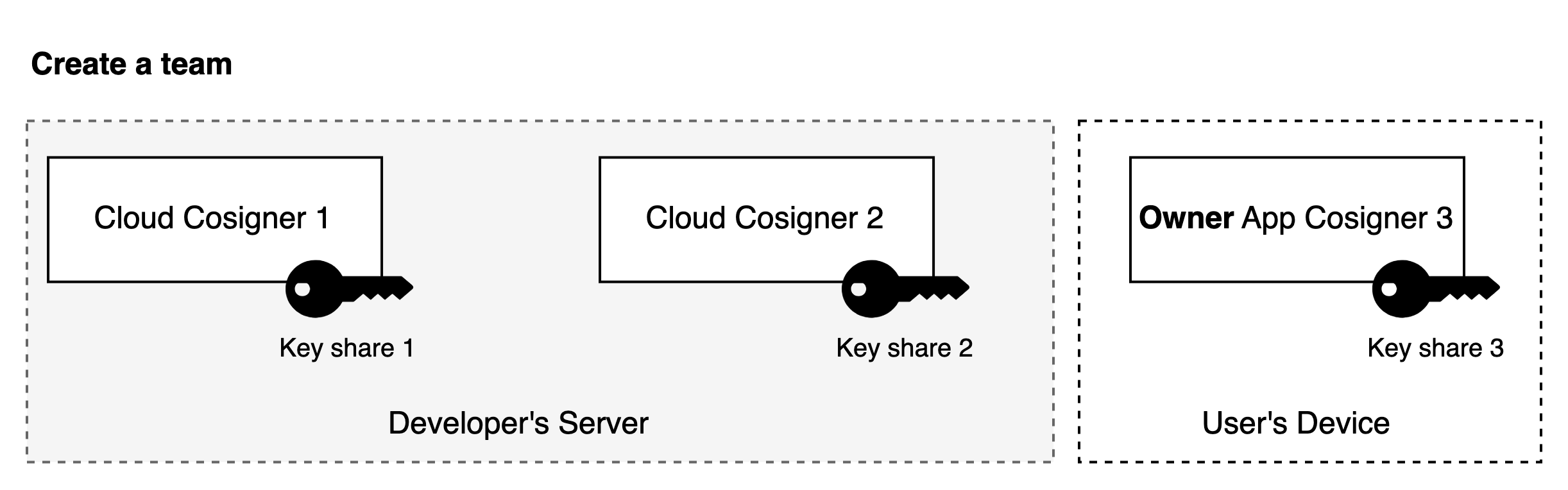 - 以 3/3 门限为例,开发者管理云端两个 Cloud Cosigner,管理其中的两个私钥分片,第三个私钥分片由客户管理