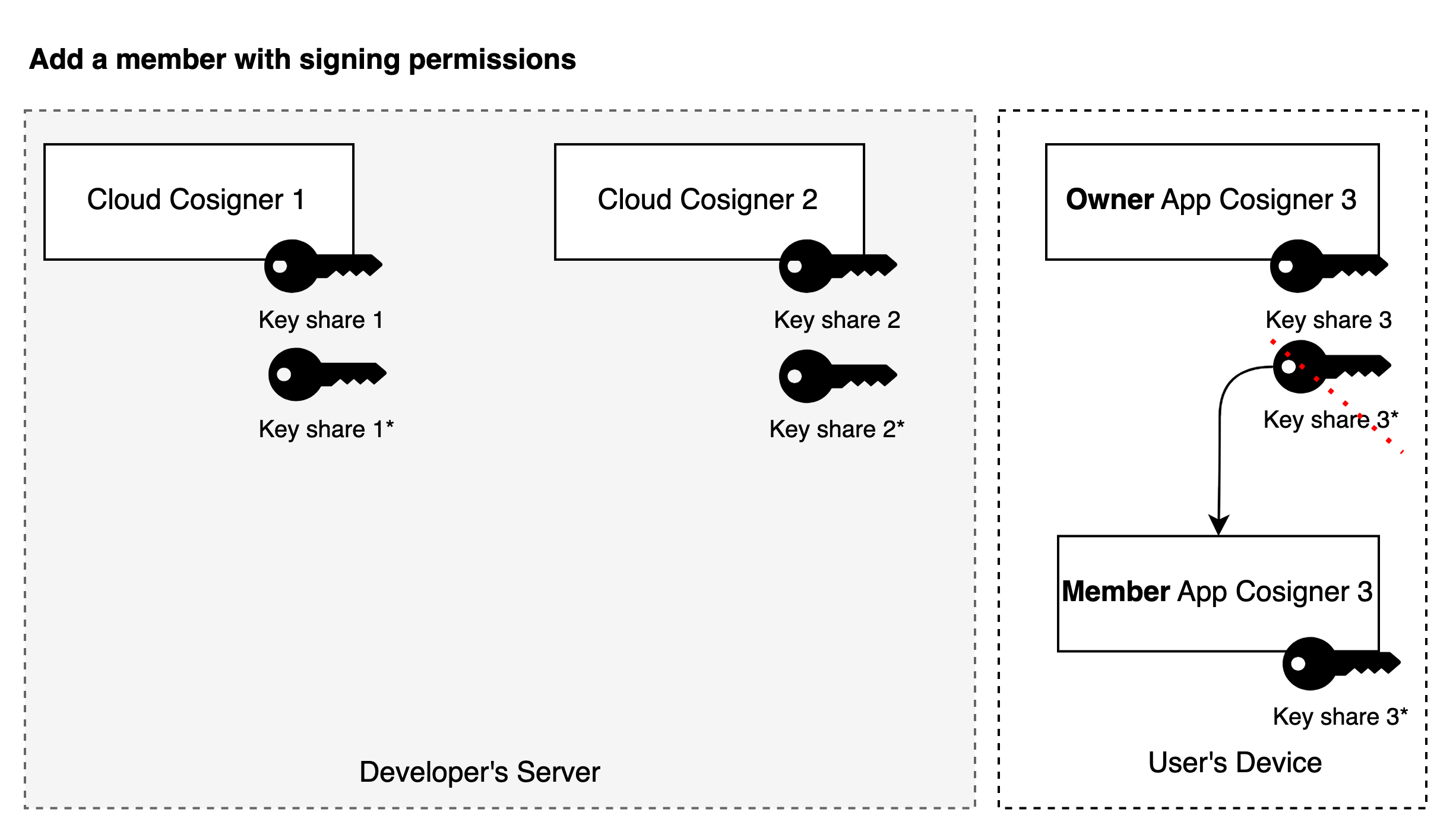 - 当添加具有签名权限的成员时,团队创建者和云端 Cloud Cosigner 执行 MPC Refresh 协议,分别在云端两个 Cloud Cosigner 和创建者设备中生成三个新的私钥分片,和老的私钥分片对应相同的扩展公钥。团队创建者通过安全的方式将新生成的私钥分片传输给新成员,并删除本地新成员的私钥分片