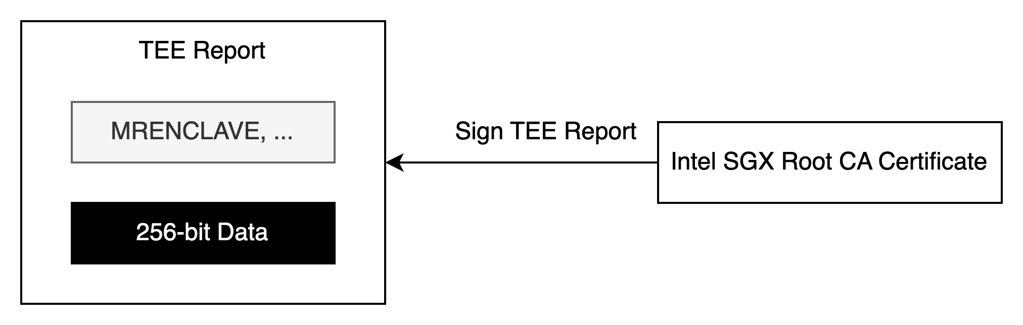 远程认证的具体实现比较复杂,涉及到 Intel SGX Root CA 证书的证书链机制,以及 PCE 中 PCK 相关授权机制,PCE 授权 QE 中 AK 机制等。为了方便理解,我们简化中间过程,直观理解为可信开发者可以在自己的 TEE 应用中创建一个 TEE 报告,这个报告中包含了 Intel SGX SDK 中自动产生的数据,其中包含了 TEE 应用的 MRENCLAVE 等,可以用于判断 TEE 应用所处环境的一些属性,以及开发者可以自定义的 256 bit 数据。Intel SGX 官方会验证这个报告是否在 TEE 中提交,并且对该报告进行签名。