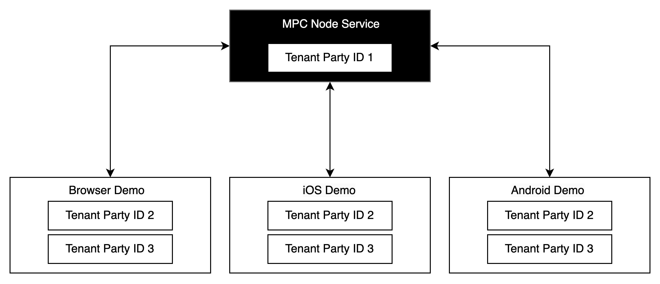 Demo 中开发者可以部署一个 SMN Service,配置租户的 Party ID 为 1。在 iOS、Android 和 Browser Demo 中集成 Embedded MPC Node,创建两个租户,Party ID 为 2 和 3。