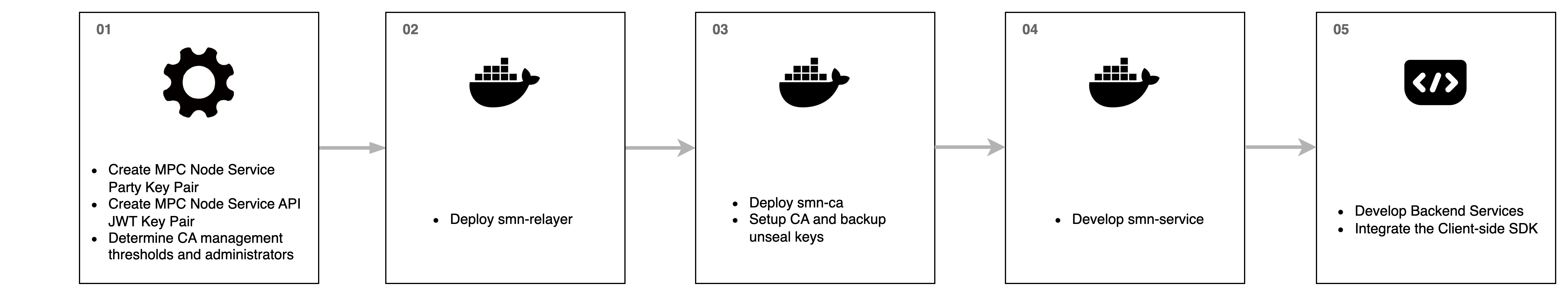 部署和集成 SMN 套件一共需要 5 个步骤,每个步骤都提供了详细的配置文档、部署文档以及接口文档,开发者可以按照 5 个步骤的顺序进行部署和集成。