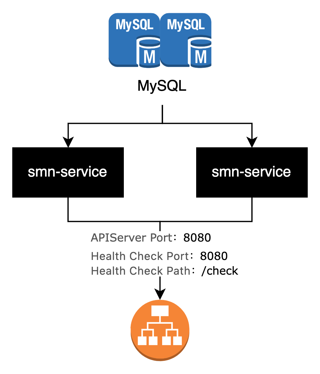SMN Service 的集群部署模式如上图所示,同一个 SMN Service 集群通过同一个 MySQL 维护 SMN Service 自身集群状态,因此只需要使用相同的配置启动多个 SMN Service,通过负载均衡器代理 SMN Service 服务即可。